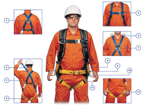 1、墜落防護連接點。2、D形環(huán)延長帶。3、向上箭頭指示。4、腿帶。5、胸帶。6、肩部D形環(huán)。7、胸部D形環(huán)。8、腰部支撐。9、腰帶。10、側(cè)面D形環(huán)。11、腿部連接。